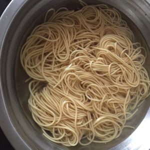 这种加了碱的干面,煮开点一次凉水再煮开,捞出放入冷水中过凉(听说南方是用电风扇吹凉)