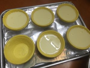 在蛋挞皮了加入适量的蛋挞液,不要太满,七八成就好了。