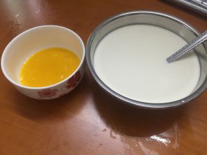 用分蛋器把鸡蛋的蛋黄和蛋白分离。蛋白去掉不用,留着蛋黄搅拌均匀待用!