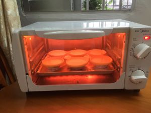 烤箱预热220度10分钟,放进装好蛋挞液的挞皮,烤18分钟。(因为我的烤箱小,所以放了下层!要烤18分钟。一般三层的,放中间,15分钟就好了)