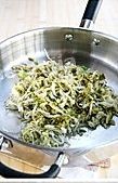 锅中油热后,放入葱、姜炒香,放入酸菜丝翻炒出香味儿;