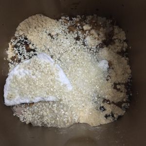把猪瘦肉倒在面包机里,放入生抽、老抽、料酒、糖粉(白砂糖用料理机打成粉的,放多点白糖比较甜哦)橄榄油、黄豆粉、芝麻。面包机调到肉松功能
