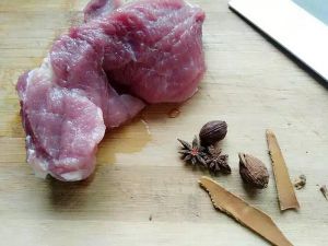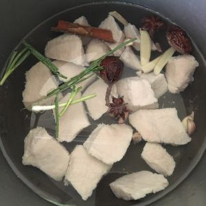 把猪瘦肉、葱姜蒜、果皮、桂皮、八角放入电饭煲,调到煲饭功能就可以了