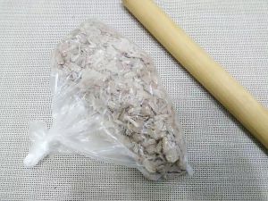压好沥干水分,装到保鲜袋,用擀面杖碾碎,越碎越好