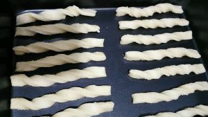 再次慢慢的擀开,刷一层全蛋液,稍等3分钟,蛋液起了粘性,撒上一层糖。烤箱180度预热,切条状拧一下成麻花在手里稍稍停留定型,放烤盘,全部做好以后再次醒发15分钟