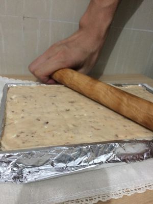 第七步:找一个有凹槽的盒子,把炒好的半成品放进去,一定要用擀面杖使劲压平哦。模具下面最好铺一层锡纸,这样不会粘黏。