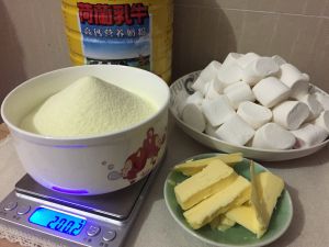 第一步:准备好材料,奶粉200克,棉花糖200克,黄油50克,杏仁50克,糖粉一些。