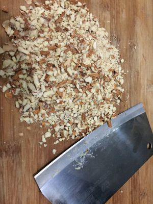 第二步:把杏仁切碎待用,可以加入一些花生米,一起切碎。
