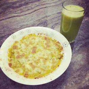 把切好的果蔬放进榨汁机榨成汁,红薯放入烤箱200度烤15-20分钟,可自行观察烤箱内情况而自行调节时间。这样营养又健康的下午茶就出来啦>_<