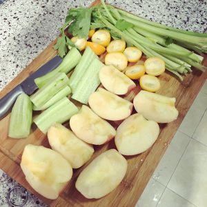 黄瓜,芹菜,苹果洗净切好,金桔可加可不加,不过金桔吃了对喉咙有好处,但是不能加太多,因为它味道有点重。
