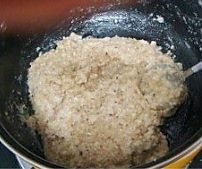 将出锅后的内馅放入盘中,压成饼状,放进冰箱冷藏30分钟,之后就不粘手了。