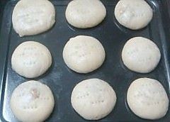 包好的饼坯排入烤盘,稍稍按扁。有一个被我按过头了,馅都挤出来了。
