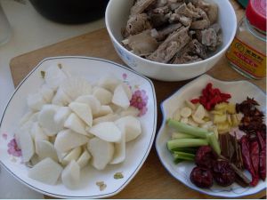 白萝卜切滚刀块,备用。葱切段,姜、蒜切片,备用。