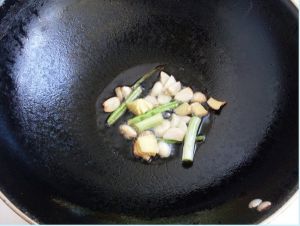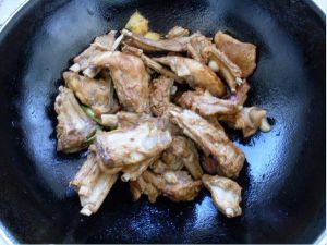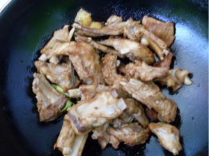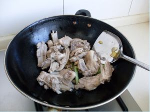 开火放炒锅,放油少许,6成热放葱姜蒜煸炒出香味后放入羊排,翻炒2分钟,放料酒、老抽,再翻炒上色。关火。