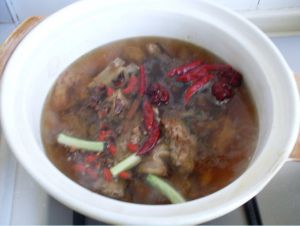 把炒好的羊排放入砂锅里(砂锅里的水已经开了),放入花椒、大料、葱段、枸杞、大枣、干辣椒、冰糖,大火炖。