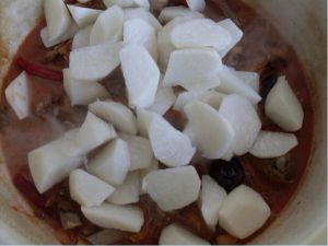 等肉用筷子一戳,能扎到底,说明肉已熟了。再把切好的白萝卜块放入。