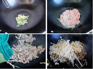 猪肉洗净切丝;金针菇去根,洗净,切段。
