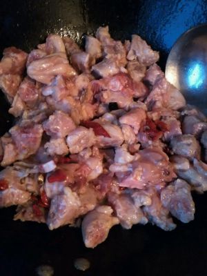 倒油,热锅,倒入鸡块,翻炒,加葱姜,辣椒,