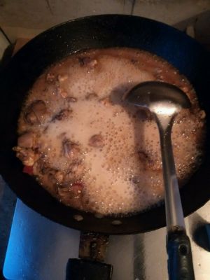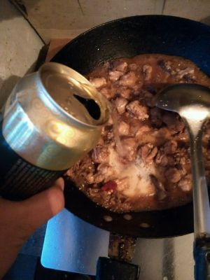 加点盐,白糖,倒入啤酒,加点老抽调色。