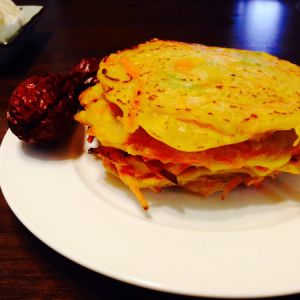 平底锅内均匀刷上一层油,舀入一勺面糊均匀摊开。一个平底锅煎两个饼