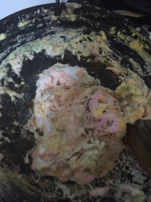 棉花糖融化后倒入奶粉和花生碎,不停翻动,防止粘锅