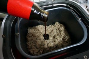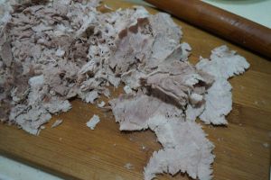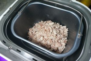 将肉片随意用手撕开,然后放进面包桶中,选择相应的程序进行搅拌,使肉片变散成肉丝
