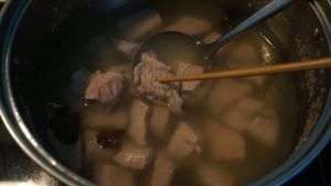 水开后,撇去表面浮沫,盖盖,关小火,待筷子能轻松扎透肉块,即可关火捞出晾凉