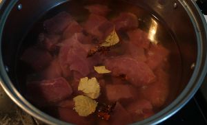 入凉水锅中,八角、香叶、料酒同入锅