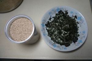 白芝麻和海苔准备好,海苔我用了4片做寿司的海苔片,用剪刀将其剪碎