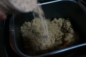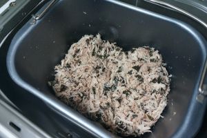 待肉丝松散后,可将海苔碎块倒入面包桶中,与肉丝共搅拌