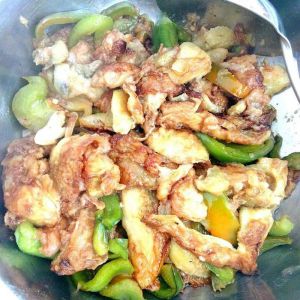 面粉+鸡蛋+盐+水,调成糊糊,倒入蒸好的茄子条。