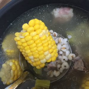 玉米、苦瓜切块,排骨洗净和姜片放入水中汆烫一下。
