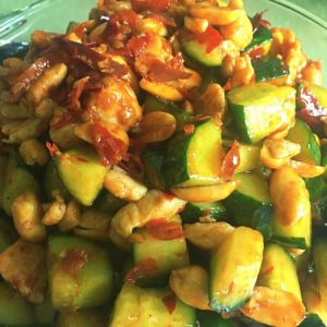 大火锅烧热后倒油并加入郫县豆瓣酱煸出红油后转中小火加入鸡丁翻炒,片刻后往锅内倒入黄瓜丁并加生抽,醋,糖,盐调味,将鸡丁黄瓜丁炒匀后再放入花生米拌匀