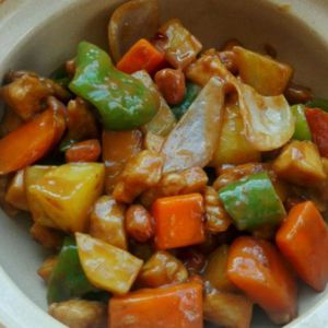 全部材料切丁,鸡丁用料酒,生抽耗油,淀粉腌制待用