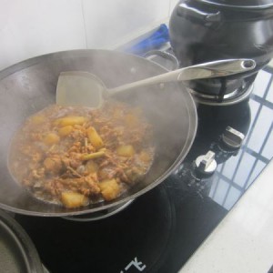 放花生油,油八成热时候放姜丝。食盐少许。鸡肉下锅,加料酒、盐。2分钟后加土豆。加水,水刚好能没过所有食材。加盐。