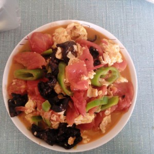 加入炒好的鸡蛋,和西红柿一起翻炒几次,加鸡精,加盐,撒上一点点葱花,出锅喽!