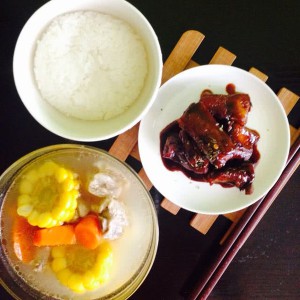 那个汤是开始煮肋排时候做的,大火时候就把玉米段儿胡萝卜块放进去,一直煮到关火,把做糖醋小排的那些排骨夹出去,汤里放盐和鸡精,就行了。有了玉米的汤特别鲜~