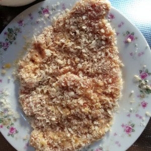 先沾面粉。再沾鸡蛋液。最后面包屑。