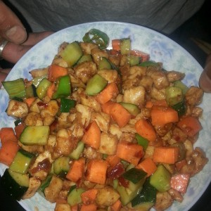 锅内放入少许油,油热后放入花生米翻炒,花生米变色放入鸡胸肉,在加入豆瓣酱,酱油,盐,鸡肉熟了放入黄瓜,胡萝卜就出锅了。
