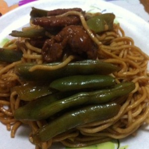 在蒸面的时候,准备好炒锅放油炒肉片葱姜,烹黄酒,下扁豆煸炒至2分钟 ,放生抽,老抽和开水焖大概10分钟。