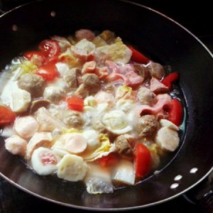 3, 烧水时,我们就处理一下菜,将白菜切块,叶子部分切大块,西红柿洗净切大块,跟肉丸子差不多大小,。然后就是肉丸子,一般的市场都可以买到,肉丸太大的可以切小,或者切花刀,肉丸子可以有猪肉丸、鱼丸、虾丸、牛肉丸,总之种类越多越好,不然怎么叫大杂烩。^_^