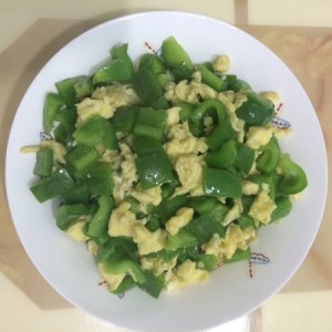 油爆香后加入青椒翻炒,再加入炒好的鸡蛋,翻炒,加入适量盐、鸡精,翻炒出锅