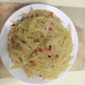 出锅前加入适量醋,翻炒,也可加入小红椒