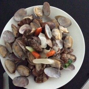 炒锅坐火,稍微放一点油,爆香葱花和辣椒,将汆过水的花蛤倒入锅中,加一点盐,翻炒均匀后盛出即可。