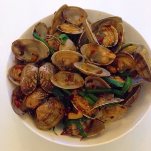 锅中油热,加入姜片翻炒,加花蛤,加秘制水(丁香 茴香 桂皮水儿:料酒 比例3:1 )
