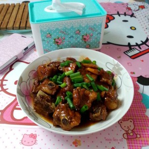 2:烧红锅下少少油,落几粒冰糖,小火煮溶下排骨炒上色的