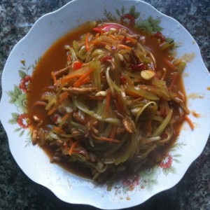 油热下肉丝,肉丝炒变色后盛出,在放油加入豆瓣酱炒出红油(用小火一定不要炒胡了)下入笋丝,萝卜丝,辣椒丝炒2分钟放少许盐,倒入调好的料汁翻炒,出锅前放入蒜末,鸡精。