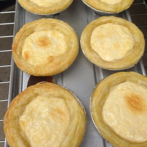 然后把蛋黄倒入调配好的牛奶里,倒入低筋面粉,打蛋器打均匀然后过筛。倒入蛋挞皮中7.8分满。