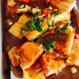 香菜切碎放在炸好豆腐上备用。姜切丝、蒜切末、葱切末,小米辣切碎,一起下锅放锅底油一点点,爆香,放黑胡椒粉,放一碗水,烧沸放盐、鸡精,一小勺糖,一小勺番茄酱,水淀粉稀释倒入锅中。烧沸关火,浇在备好的豆腐上。切记一定要浇在香菜上,这样香菜的味道就很浓了!