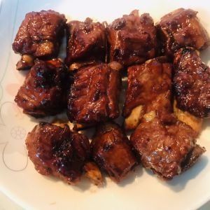 将1勺料酒、2勺酱油(可以加一丢丢老抽着色)、3勺醋、4勺糖加入炸过的排骨,我提前配好的所以直接一碗倒进去了